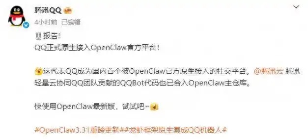 4月1日,据腾讯QQ官方微博消息,QQ宣布正式原生接入OpenClaw官方平台。这代表QQ成为国内首个被OpenClaw官方原生接入的社交平台。